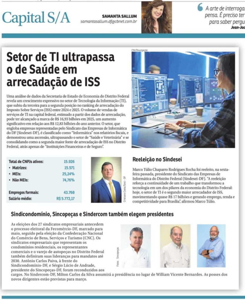 O desempenho reflete a expansão das atividades tecnológicas, o aumento da formalização e a crescente demanda por soluções digitais no Distrito Federal. A matéria também registra a reeleição da presidência do Sindesei-DF, em um contexto de continuidade institucional e fortalecimento do setor, que se consolida como um dos principais motores de geração de emprego, renda e desenvolvimento econômico na capital federal.
